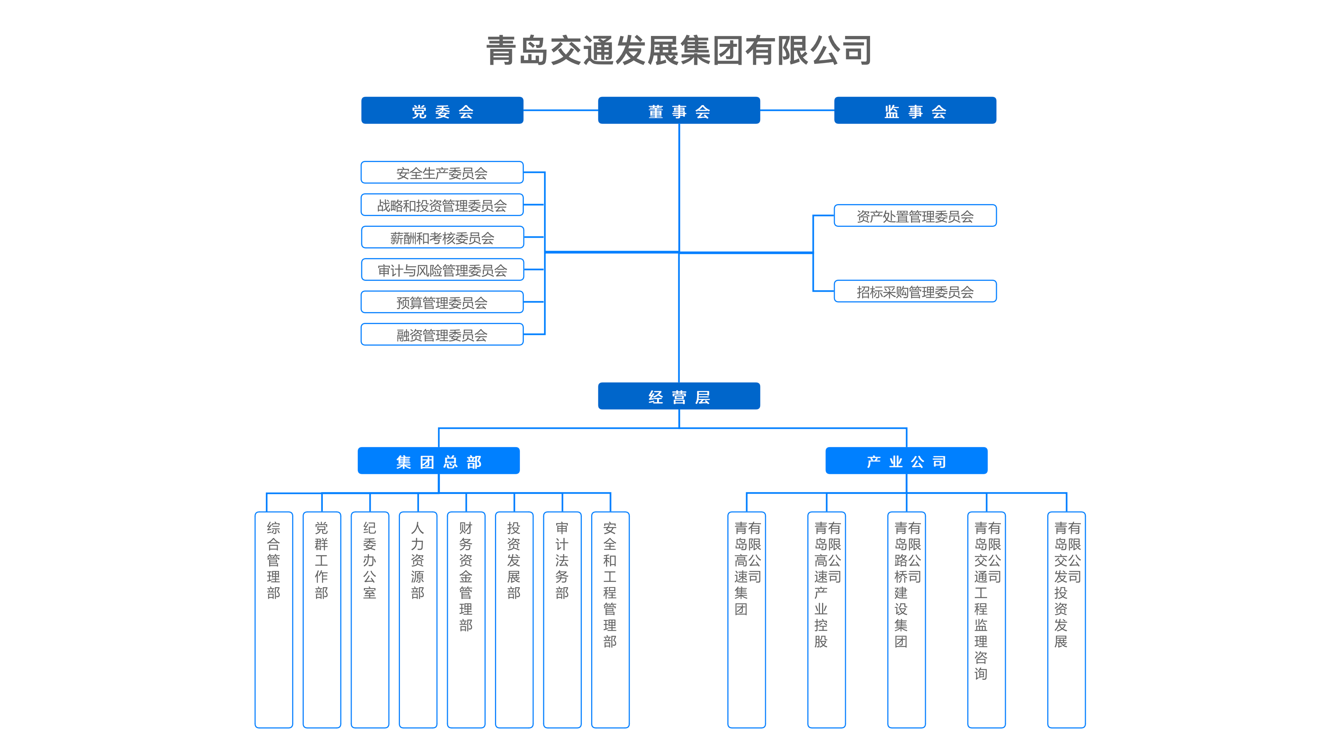 青島交通發(fā)展集團有限公司(以下簡稱“交發(fā)集團”)成立2012年5月,注冊資本10億元,定位為青島市交通建設(shè)投融資主體,負責(zé)所轄高速公路等交通基礎(chǔ)設(shè)施的運營、養(yǎng)護、管理工作和投融資建設(shè)任務(wù),承擔(dān)青島市未來高速公路發(fā)展和交通基礎(chǔ)設(shè)施建設(shè)投融資等職能?,F(xiàn)有所屬二級企業(yè)18戶,干部職工2100余人。